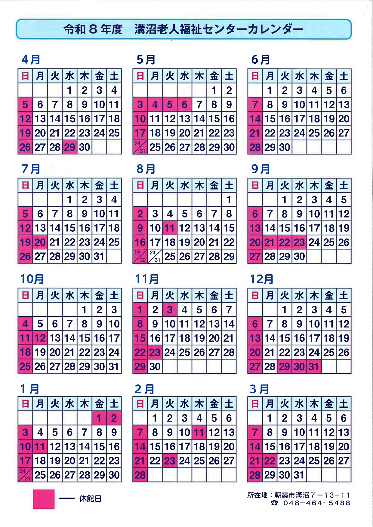 | 交通案内 | 東武東上線朝霞台駅、JR武蔵野線北朝霞駅から徒歩15分もしくは市内循環バスで『溝沼老人福祉センター』下車すぐ |