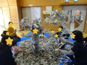 新聞紙の輪っかを棒で飛ばしたり、ビリビリ破いたものを、ふらせたりして、ダイナミックに遊んでくれました♪