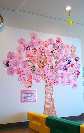 仙台市鶴巻児童館、ひざおり児童館それぞれの子ども達が作ってくれた桜の花びらを合わせて、満開の桜の木ができました。